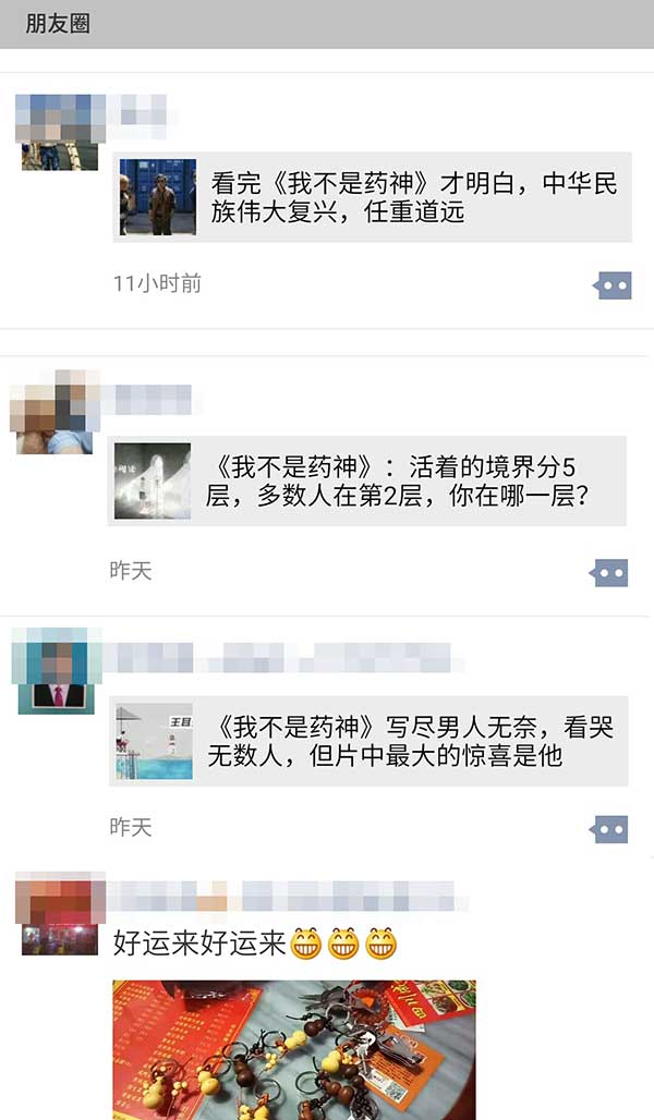 最近,朋友圈被《我不是药神》刷屏,出现了很多看似深刻的文章,大意是从电影映射出中国的医疗环境和社会现状。有些人甚至由此看出男人的苦,社会层级,标题大都是悬疑式,比如:“《我不是药神》写尽男人无奈,看哭无数人,但片中最大的惊喜是他”,“《我不是药神》:活着的境界分5层,多数人在第2层,你在哪一层?”,甚至“看完《我不是药神》才明白,中华民族伟大复兴,任重道远”……诸如此类的标题,不胜枚举,我反正不会点进去看的,光看标题就讨厌。