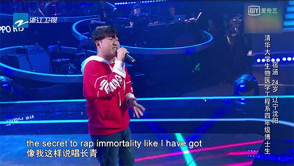 要说《中国好声音》高材生,24岁的沈阳男孩宿涵可能是第一个,他是清华大学生物医学工程系四年级博士生。用周杰伦的话说,他不但是学习上的高材生,更是音乐上的高材生,他用一首《止战之殇》征服了四位导师,又是四转!那段快节奏的说唱还真不错,最后来一段超快英文RAP,听着真享受。最让人惊叹的是,宿涵用人工智能写歌,改编了周杰伦的歌词,连周杰伦都没听出来。在选择导师的过程虽然出现了一个插曲,崇拜了一番李健,让周杰伦紧张了一下,结果说周杰伦不是他的偶像,而是他的信仰,周杰伦心头一块石头才落地。