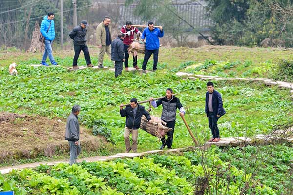 表哥也是农村的精壮劳动力,要不是刚在工地受伤,一头四百斤的猪他也抬得动,抬猪还要更懂技术,不光是重,有时候猪还要动几下,没点力气和经验完全不敢抬。