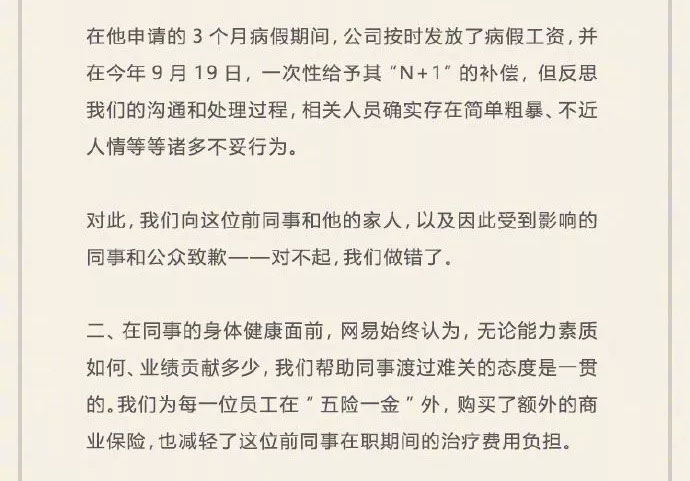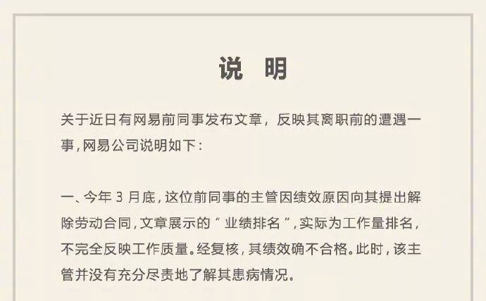 网易称将继续尝试和发帖者进行积极有效的沟通,推进事件妥善处理,也愿意为这位前同事提供一切可行的援助。