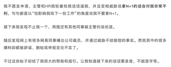 被主管和HR轮番谈话,且变相威胁说“拿N+1的话会非常不利”(即工作年份折算月份+1个月的补偿,比如他工作了5年,就应该是5+1=6个月的),拒绝给予赔偿,原因是“怕影响找下一份工作”。