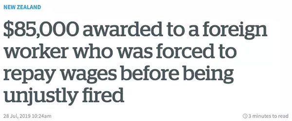 2019年7月,一位新西兰的老板因为无理地解雇了一位华人员工,结果赔偿8.5万纽币。