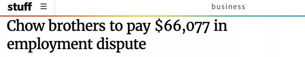 最终该员工向雇佣关系局进行了投诉,雇佣关系局认为:公司在劳资关系没有达到不可调和的情况下解雇员工,是不公正的行为!最终,周氏兄弟旗下的公司被要求赔偿员工损失的薪水48,077纽币外加18,000纽币的人道和尊严损害赔偿。