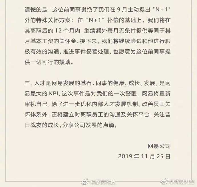 伴随着舆论的发酵,25日下午网易公司对“暴力裁员”事件作出回应,并发表公开声明致歉,称“这次事件是对我们的一次警醒,网易将重新审视自己”。
