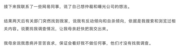 帖子原文最终,在公司,这位曾经以自己身份无比自豪的“网易人”,在HR、HR总监以及几个保安的“包围”下,电脑被拆除,个人物品被搜查,被“簇拥”着离开了公司……