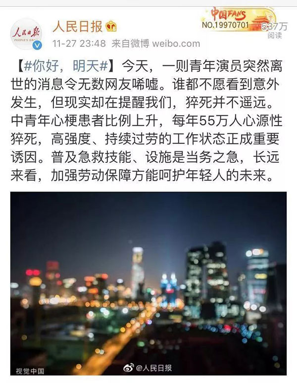 在前景大好的当下,却在录制节目中过劳意外猝死。