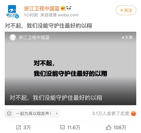 高以翔事件发生的第9天,浙江卫视第三次发声并道歉,“对不起,我们没能守护住最好的以翔。”同时也透露《追我吧》节目永久停播。