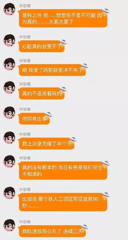 钟楚曦称录制《追我吧》“太累太累了”,自己录了两期就坚决不去录制了,录完节目缓了半个月,甚至吃了三天速效救心丸。