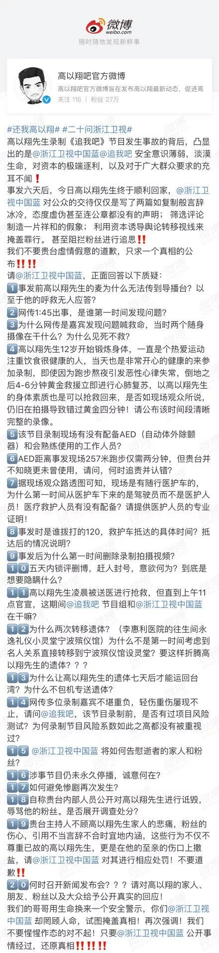 而在浙江卫视此次公开发声之前,12月3日,高以翔吧官微曾提出20条问题追问浙江卫视,对照此次浙江卫视的发声,有一些粉丝的疑问,依然没有得到解答。