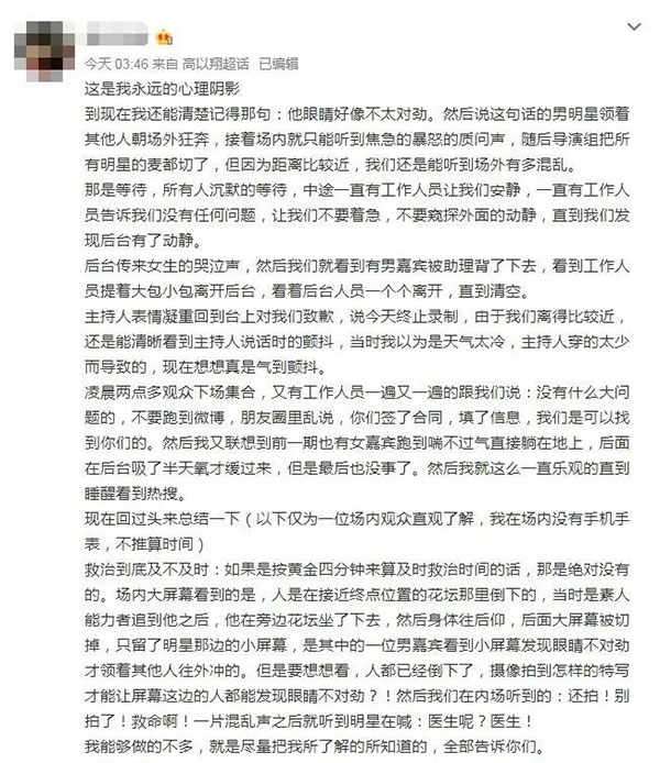 一位内场男嘉宾通过明星的小屏幕,发现高以翔眼睛不对劲,才领着其他人往外冲。现场观众这才听到有人喊“别拍了,救命”的声音。