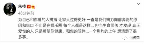 朱桢称: “当生命陨落才发现,真正爱你的人只是希望你健康,和你的陪伴……”自己因为这件事想通了很多。