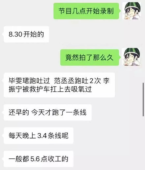 “毕雯珺跑吐过,范丞丞跑吐2次,李振宁被救护车抗上去吸氧过。”