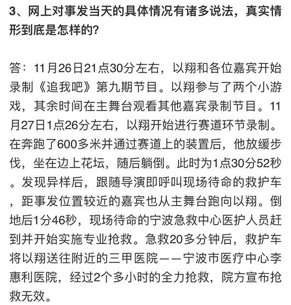 “11月27日1点26分左右,以翔开始进行赛道环节录制。在奔跑了600多米并通过赛道上的装置后,他放缓步伐,坐在边上花坛,随后躺倒。此时为1点30分52秒。发现异样后,跟随导演即呼叫现场待命的救护车,距事发位置较近的嘉宾也从主舞台跑向以翔。”林涌直言,在高以翔“倒地后1分46秒,现场待命的宁波急救中心医护人员赶到并开始实施专业抢救。急救20多分钟后,救护车将以翔送往附近的三甲医院。”针对网友质疑现场医护人员配备不够的声音,林涌也回应称,“现场配备了宁波急救中心的2辆救护车、3名专业医护人员和2名救护车驾驶员。救护车上配备专业急救设备,包括除颤设备(在抢救中有使用),急救人员身着荧光色工作服。”至于网友爆料的“在凌晨2点看到救护车赶到现场”的说法,林涌也解释说,“实际上他们看到的是工作人员拨打120后叫来的第3辆救护车,之后没有使用,空车返回。”