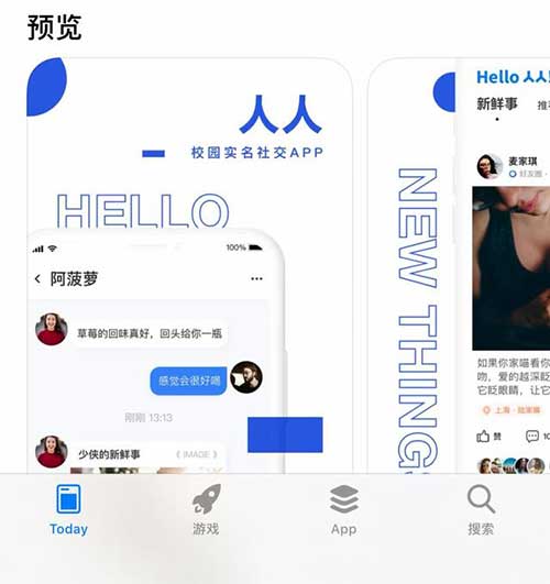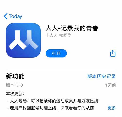 近几日,不少细心的网友发现,人人APP在苹果应用商店悄悄上架。看着蓝色的背景上两个白色的“人”字,记忆仿佛瞬间穿越到学生时代。新版人人APP有了更多校园气息,但这份“情怀”能否再会“85后”“90后”用户、吸引“00”后在校生?