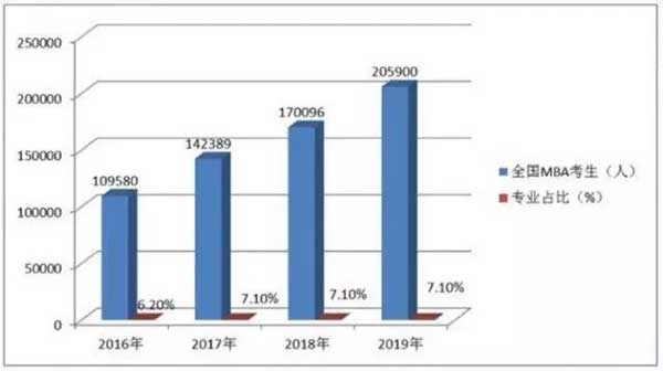 而在专硕项目中,工商管理独占鳌头,2018年报名人数达17.01万人次,2019年报名人数高达20.59万人次。