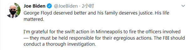 美国民主党总统参选人、前副总统拜登在推特上为死者发声