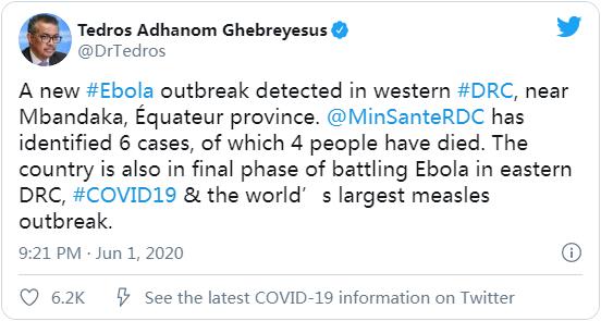 世卫组织总干事谭德塞在推特上写道:”埃博拉新疫情在刚果民主共和国西部赤道省姆班达卡市附近出现。卫生部已经确认6例感染病例,其中4人死亡。”