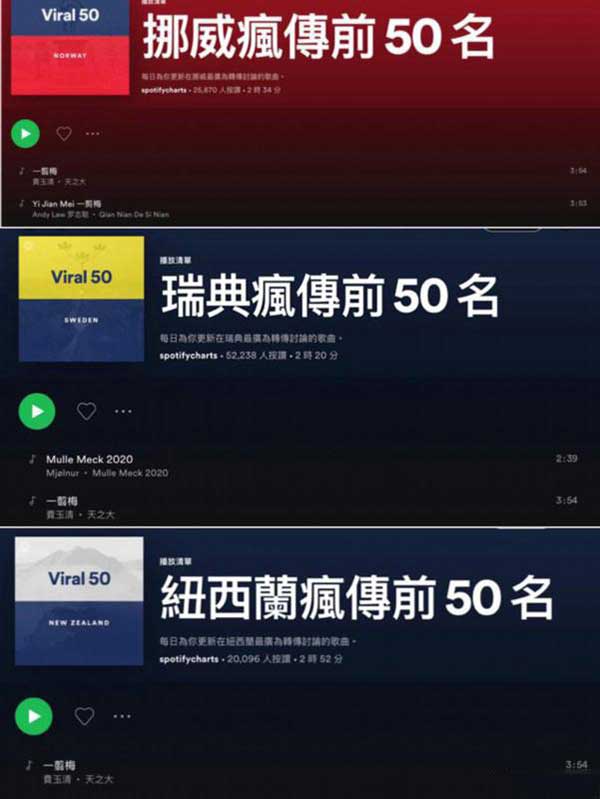 近日费玉清演唱的《一剪梅》在欧美热度居高不下,在知名音乐软件Spotify上,该曲在挪威热门歌曲排行榜获得第 1、芬兰排行榜排第2、瑞典排行榜也是第2.