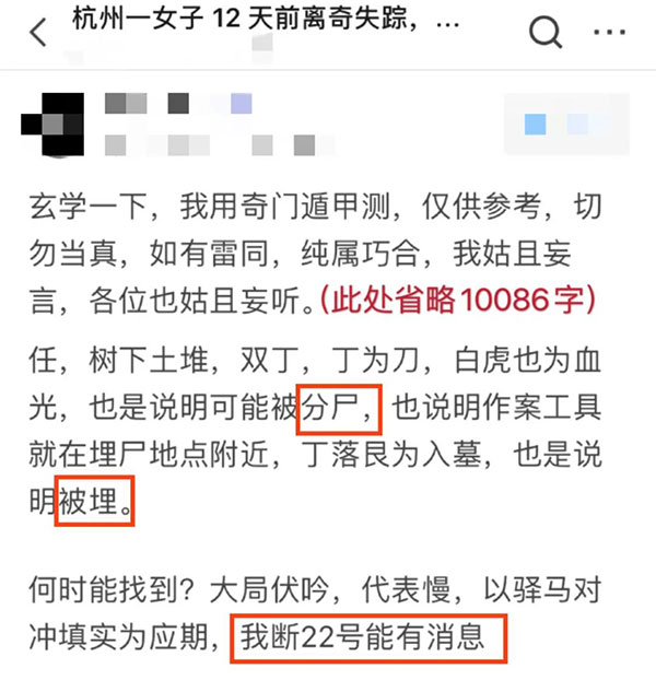 同一天,花瓣7组出现了一个神秘的帖子,一位网友用奇门遁甲预测出来了女士失踪案的结果:已遇害、埋在土下、22号会发现。