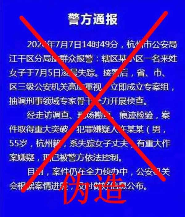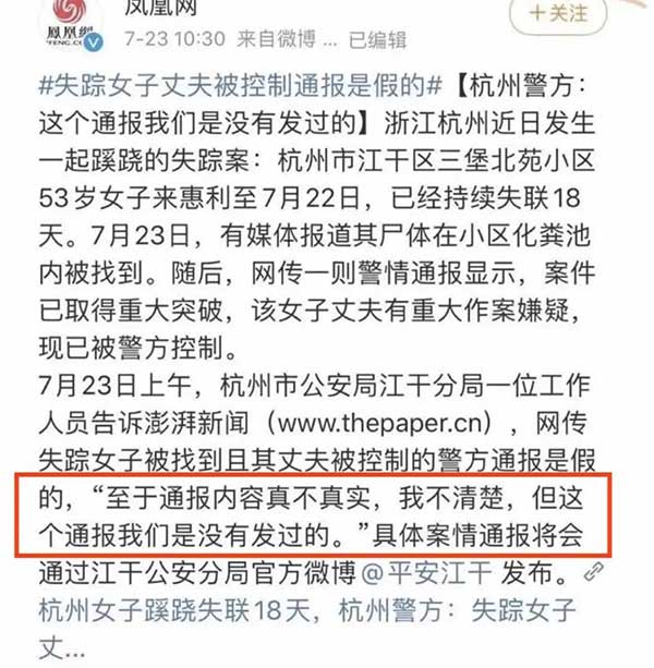 7月23日,来女士失踪18天。一早,网上出来一个新闻(谣言):警方22号在处理来女士家周边的下水道、化粪池,23号发布来女士遇害消息。