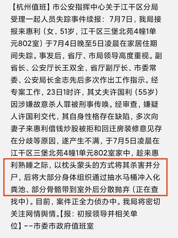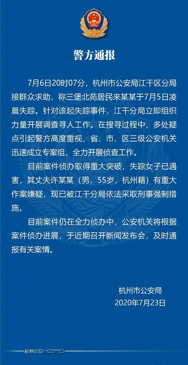 人们还在积极帮忙分析“走之前仅穿了一件不适合出门的吊带睡裙,没带手机没带钱包没带钥匙”的来女士究竟会去哪里?7月23号这天,杭州公安首发通报,她已经遇害了。
