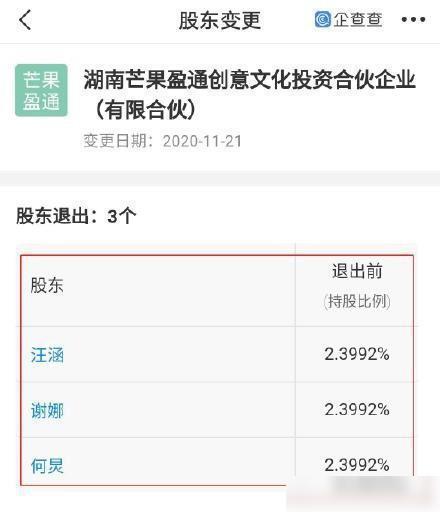 11月23日中午,知情人士发博爆料,近日芒果文创基金所属湖南芒果盈通创意文化投资合伙企业(有限合伙)发生工商变更,股东汪涵、何炅、谢娜退出,退出前各持股2.3992%。