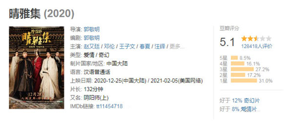 截至目前,《晴雅集》共上映11天,取得了4.5亿元票房的好成绩,虽然在票房上取得了亮眼的数据,但是《晴雅集》的口碑却高开低走,在专业影评网站上网友给出了2星半只有5.1分的评价,其中31%的人给了1星,占比最多。