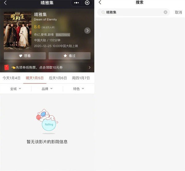 再次被曝出全部下线的消息后,目前在售票网站上已经搜不到《晴雅集》的内容了,其中一家售票网站显示1月5日《晴雅集》没有任何排片,另一家售票网站则直接搜索不到《晴雅集》的相关信息,主流的实时票房榜也已经将《晴雅集》移除。