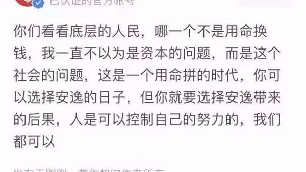 讲的偏激点,工作虽没有贵贱之分,但真的有高低之差。同样工作1小时所创造的价值,是呈几倍几十倍差异的。在这种情况下,都挣1000块钱,有些人需要工作1小时,有些人需要工作5小时,你能说工作1小时的人是在安于享乐?不能吧?