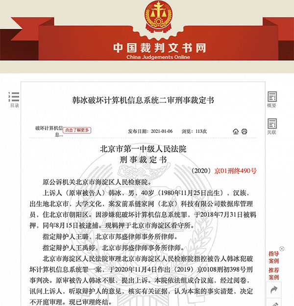 中国裁判文书网1月7日消息,北京市第一中级人民法院日前发布韩冰破坏计算机信息系统二审刑事裁定书。北京一中院认为,一审法院根据韩冰犯罪的事实、犯罪的性质、情节及对于社会的危害程度所作出的判决,事实清楚,证据确实、充分,定罪及适用法律正确,量刑适当,审判程序合法,应予维持。北京一中院裁定:驳回上诉,维持原判。