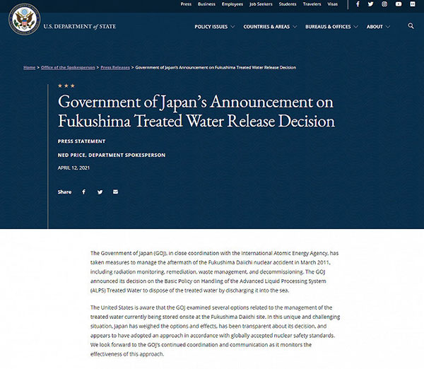 美国务院在日本政府正式宣布上述决定之后,在官网发布声明称,“日本政府与国际原子能机构(IAEA)密切合作,已采取措施对2011年3月福岛第一核电站核事故的后果进行处理。日本政府已宣布关于ALPS(多核素去除设备)处理水的基本政策的决定,将处理后的核污水排入大海。”