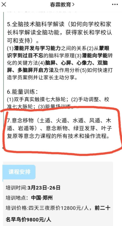 有媒体发现,在该校的微信公众号上,甚至还出现了“意念移物(土遁、火遁、水遁等)”的培训课程。这就不简单是误人子弟的问题了。此风不灭,那之后旁门左道、奇门遁甲是不是都可以拿来培训骗钱了?