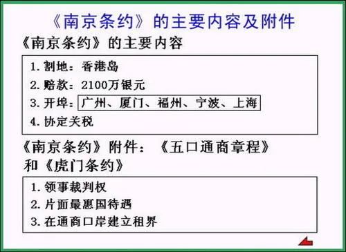 一是清政府开放广州、厦门、福州、宁波、上海等五处为通商口岸(史称“五口通商”),准许英国派驻领事,准许英商及其家属自由居住。
