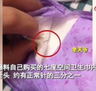 6月5日,江西鹰潭,网友爆料自己购买的七度空间卫生巾内发现针头,约有正常针的三分之一。据当事人唐女士:刚打开卫生巾准备使用时发现有异物,撕开后发现一个针头。唐女士表示,目前只想知道针头存在的时间和原因,也想提醒所有使用者多留意。目前,该公司客服回应称,已在调查该批次产品,将于2个工作日回复唐女士。