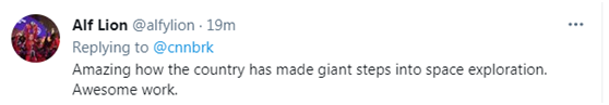 “太了不起了,这个国家在太空探索上迈出了巨大一步。很棒!”↓