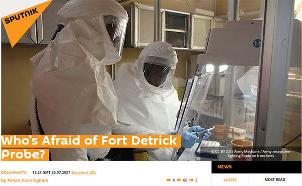 俄罗斯卫星通讯社网站26日发表专栏作家费南?坎宁安的署名文章《谁害怕调查德特里克堡?》。文章指出,中国网民联署呼吁调查德特里克堡,然而联署网页伺服器疑似遭到美国网络攻击,这让德特里克堡显得更加可疑。德特里克堡臭名昭着,其安全问题由来已久,中国呼吁对美设施进行调查合情合理。