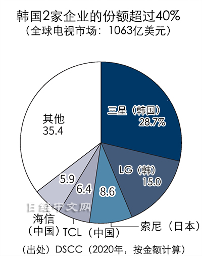 根据日经中文网报道,美国调查公司DSCC的统计显示,在全球电视市场,三星2020年的份额以约29%排在首位,之后依次是韩国LG电子的15%、日本索尼为9%。而中国的TCL和海信只有6%,海尔甚至没有显示度。