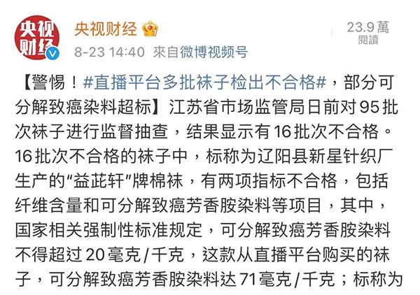 8月23日中午,央视网曝光了关于袜子致癌染料超标的信息。江苏省市场监督管理局对线上在售袜子的进行抽检,尤其是电商和直播平台所销售的部分袜子,这些袜子价格低廉,大多为三无产品。检测结果显示其除甲醛含量严重超标以外,所含的可分解致癌物——芳香胺染料,超过国家相关强制性规定标准的三倍有余。