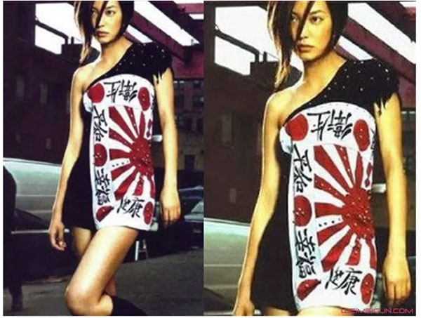 谁料,2001年12月,祸起萧墙,赵薇不知哪根筋不对劲,于纽约街头施施然披一印有巨型日本军旗的所谓时尚服饰,大走其秀,并拍下多张照片,刊登于时装杂志,引发国人义愤。
