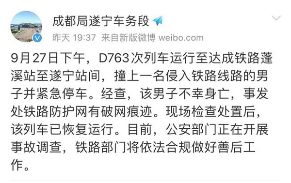 昨晚,@成都局遂宁车务段 发布消息证实了此事。根据通报,9月27日下午,D763次列车运行至达成铁路蓬溪站至遂宁站间,撞上一名侵入铁路线路的男子并紧急停车。