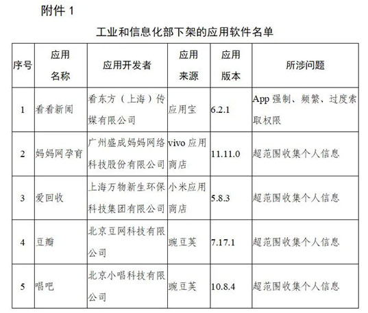 记者注意到,工信部下架的五款应用软件名单中,看看新闻所涉问题是“APP强制、频繁、过度索取问题”,妈妈网孕育、爱回收、豆瓣、唱吧等四款应用所涉问题是“超范围收集个人信息”。