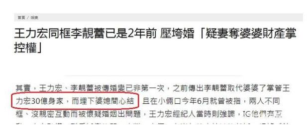 王力宏有30亿的个人财产,之前一直是由王力宏的母亲,李靓蕾的婆婆亲手打理。而在王力宏结婚之后,李靓蕾全面介入了王力宏的生活和事业,不仅仅陪他出席公开场合晒恩爱,连演唱会庆功宴都有她穿梭的身影,甚至还代表王力宏所属的宏声音乐,跟合作商洽谈工作细节。