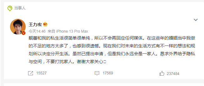 今天下午,面对离婚传闻,王力宏亲自发文回应,其表示离婚的原因,是因为双方对未来的规划有所分歧,所以决定分开生活,但是和李靓蕾将会是永远的一家人。