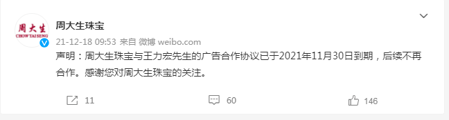 周大生珠宝发文回应,与王力宏先生的广告合作协议已于2021年11月30日到期,后续不再合作。感谢您对周大生珠宝的关注。