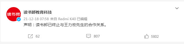 读书郎教育科技微博12月18日消息,读书郎决定即日起终止与王力宏的合作关系。