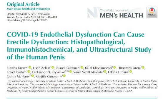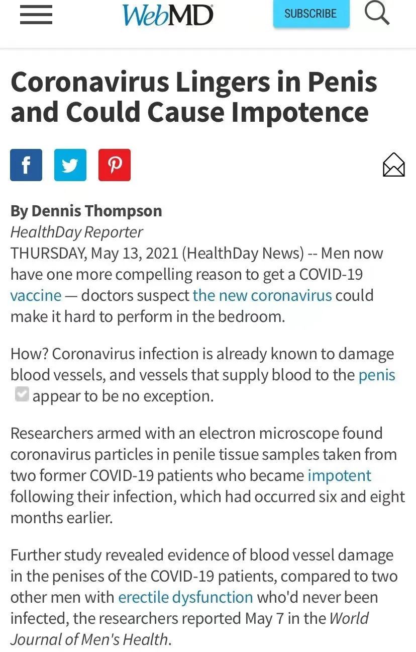 《纽约邮报》这篇文章引用了《世界男性健康杂志》的一篇论文,说在阴茎组织内发现了新冠病毒,新冠会引起血管内皮功能障碍,从而影响包括阴茎和睾丸在内的许多器官。