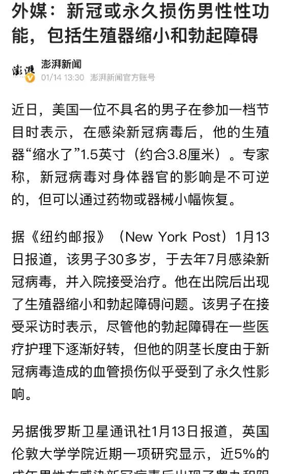 最近有一个热传的话题,说是新冠感染会不会造成生殖器缩小和永久损伤男性功能。