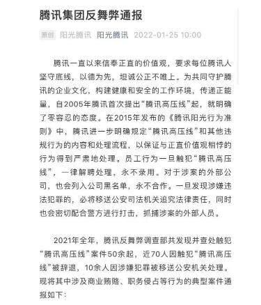 今日,腾讯集团发布的反舞弊调查显示,2021年全年,腾讯反舞弊调查部共发现并查处触犯“腾讯高压线”案件50余起,近70人因触犯“腾讯高压线”被辞退,10余人因涉嫌犯罪被移送公安机关处理。
