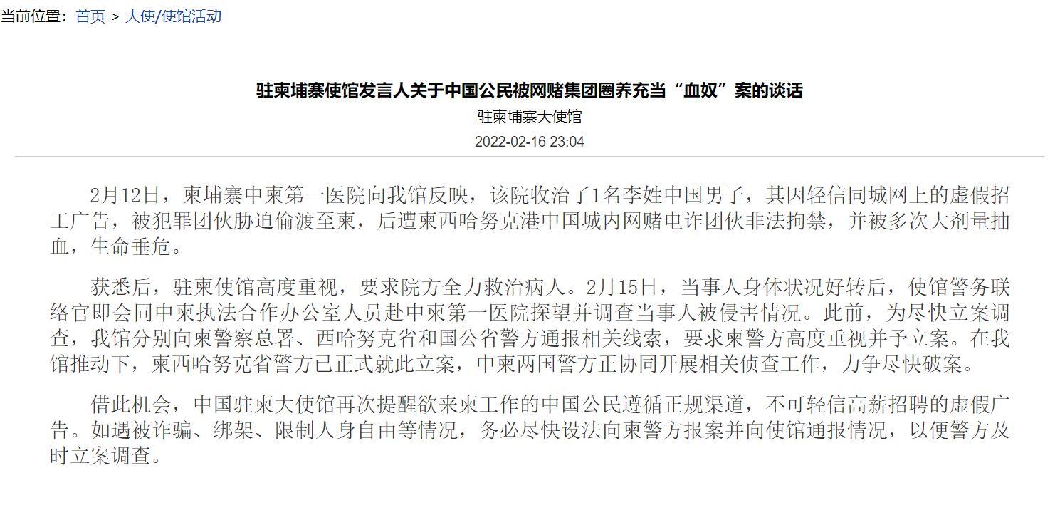 2月16日晚,中国驻柬使馆官网就此事发布消息称,2月12日,柬埔寨中柬第一医院向我馆反映,该院收治了1名李姓中国男子,其因轻信同城网上的虚假招工广告,被犯罪团伙胁迫偷渡至柬,后遭柬西哈努克港中国城内网赌电诈团伙非法拘禁,并被多次大剂量抽血,生命垂危。