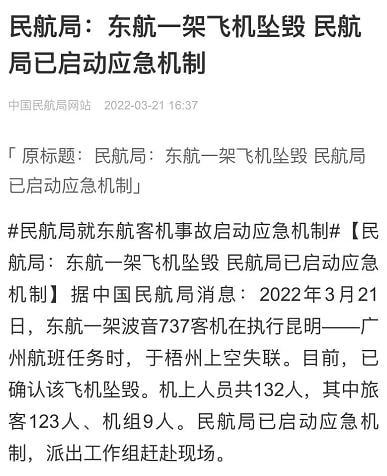 据中国民航局16点34分消息,3月21日,东航一架波音737客机在执行昆明至广州航班任务时,于广西梧州上空失联。目前民航局方面已确认该飞机坠毁,机上人员共计132人,其中旅客123人,机组9人,民航局已启动应急机制。